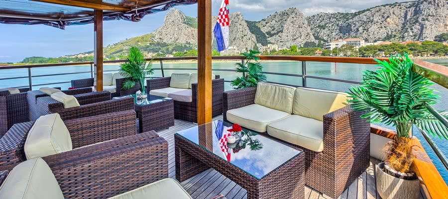 Inselhüpfen mit unseren First-Class-Schiffen Ausstattung Die stilvoll eingerichteten Kabinen unserer First Class-Schiffe halten mühelos dem Vergleich mit einem Hotelzimmer stand. Mit 10 - 15 m² bieten sie genügend Wohlfühl-Raum. In den Gästekabinen steht zusätzlich zum erlesenen Interieur auch ein Safe bereit. Der Decksbereich der Schiffe bietet zahlreiche bequeme Sitz- und Liegemöglichkeiten. Eine Badeplattform am Heck ermöglicht Ihnen einen völlig unkomplizierten Zugang zum Meer. Leben an Bord Auch in der First Class-Kategorie ist der Salon der Dreh- und Angelpunkt des Bordlebens. Die Salons bestechen nicht nur durch ihre Größe, sondern auch durch die ausgesprochen edle Ausstattung und Einrichtung. Hier finden Sie auch das bordeigene Klavier, auf dem gerne musiziert werden darf. Die Crew ist jederzeit um das Wohlergehen ihrer Gäste besorgt und geht gerne auf individuelle Wünsche und Bedürfnisse ein. Wenn Ihnen nach einer erlebnisreichen Radtour der Sinn nach einem erfrischenden Kaltgetränk steht, können Sie dieses auf dem beschatteten Oberdeck in gemütlicher Lounge-Atmosphäre genießen. Neben der täglichen Gelegenheit in den schönsten Badebuchten direkt vom Schiff ins Meer zu springen, bieten Ihnen unsere First Class-Schiffe auch verschiedenste Wassersportmöglichkeiten: Paddeln Sie mit den bordeigenen Kanus, testen Sie Ihre Balance auf den SUPs oder erleben Sie schnorchelnd die wunderschöne Unterwasserwelt Kroatiens Besonderheiten Unsere First Class-Schiffe besitzen wie die Deluxe-Schiffe bordeigene Fahrradgaragen, die Laderaum und Akkulademöglichkeiten für eine große Zahl von E-Bikes bieten. Whirlpool, Bordklavier und die große Auswahl an Wassersportmöglichkeiten sind exklusive Merkmale dieser Schiffsklasse. Inselhüpfen-Destinationen Unsere First Class-Schiffe sind für Sie in Kroatien unterwegs.