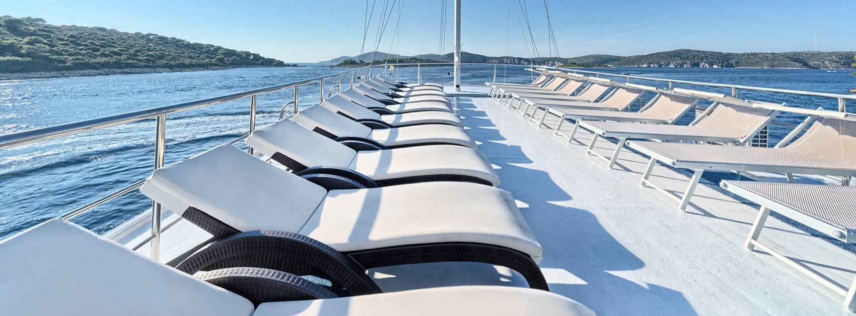 Hochwertiges Lounge-Mobiliar auf den Außendecks, aber auch bequeme Holzstühle an Tischen sowie eine weitläufige Liegewiese auf dem Sonnendeck machen den Außenbereich der Pape Prvi zu einer Entspannungs-Oase auf See. Über eine Badeplattform am Heck des Schiffes ist der Zugang zum Meer unkompliziert möglich und dem Badespaß in einsamen Buchten steht nichts entgegen.