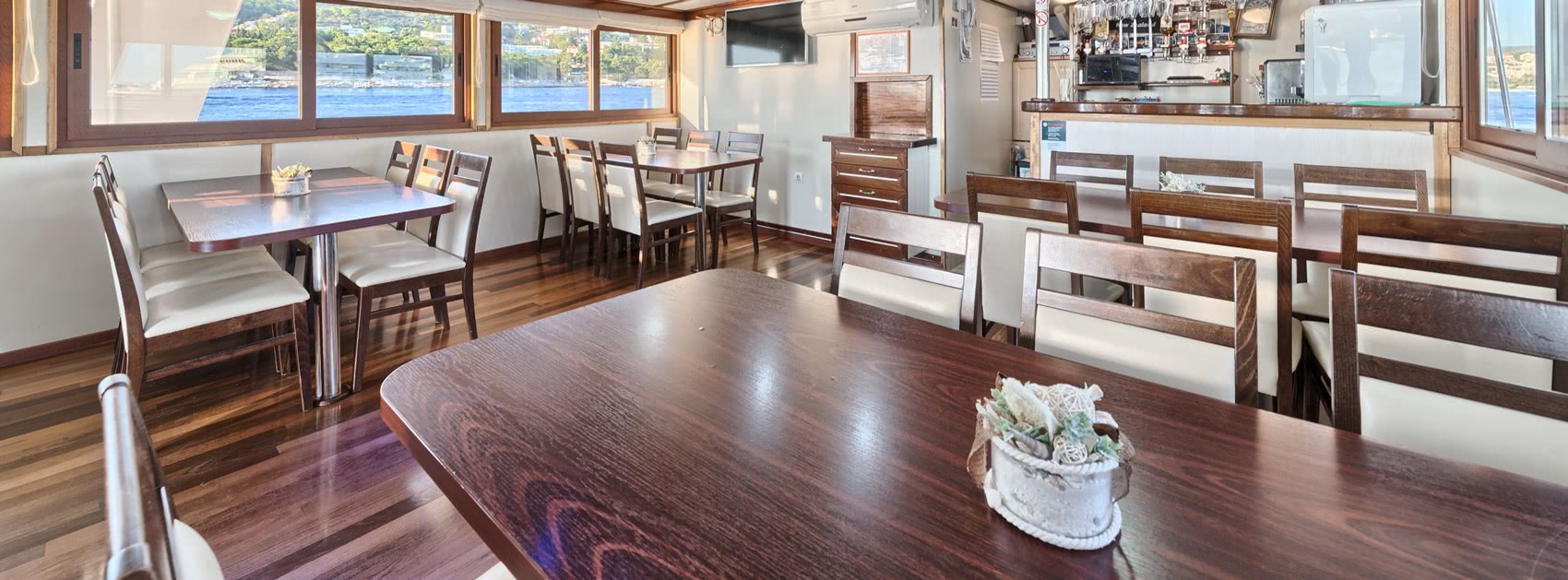 Die Gästekabinen besitzen ein geschmackvolles Interieur. Fünf dieser Kabinen befinden sich unter Deck, neun weitere über Deck. Der großzügig angelegte helle Salon verbreitet eine gemütliche Atmosphäre. Große Esstische mit gepolsterten Stühlen sorgen dafür, dass unsere Gäste auch außerhalb der Mahlzeiten gerne im Salon verweilen und beisammensitzen. An der in den Salon integrierten Bar kann man sich jederzeit mit erfrischenden Getränken versorgen.