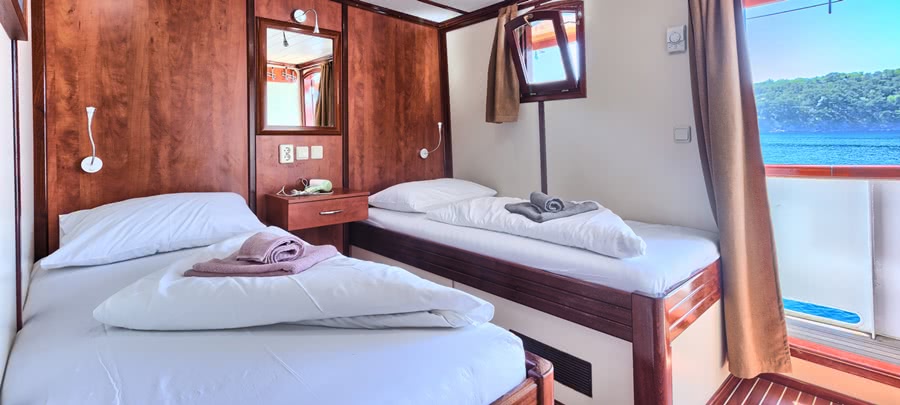 Inselhüpfen mit unseren Deluxe-Schiffen Ausstattung Unsere Deluxe-Schiffe bieten, was der Name verspricht: Eine erlesene Ausstattung sowie großzügig angelegte Kabinen (10 - 15 m2) und geräumige Bäder mit abgetrennten Duschkabinen lassen beinahe vergessen, dass man sich auf einem Schiff befindet. Sie haben mehr als genug Platz, um sich in Ihrem schwimmenden Zuhause für eine Woche wohnlich einzurichten. Auch dem Sprung ins erfrischende Nass steht nichts im Weg: Die Badeplattform am Heck der Schiffe ermöglichen einen einfachen und problemlosen Zugang zum Meer. Leben an Bord Im elegant gestalteten Salon treffen Sie sich zum Essen oder zum gemütlichen Beisammensein. Lassen Sie sich zu den Mahlzeiten mit kulinarischen Raffinessen aus der Bordkombüse verwöhnen. An den großen Tischen können Sie außerdem in geselliger Runde ein leckeres Getränk von der bordeigenen Bar genießen, Seemannsgarn spinnen oder eine Spielerunde ins Leben rufen. Auf den weitläufigen Sonnendecks unserer Deluxe-Schiffe finden Sie eine Vielzahl bequemer Liegematten und -stühle für ein entspanntes Sonnenbad. Genießen Sie Ihren Morgenkaffee bei schönstem Meerblick auf den mit Lounge-Mobiliar ausgestatteten beschatteten Achterdecks. Besonderheiten In die Planung und Konstruktion unserer Deluxe-Schiffe ist der zunehmende Wunsch unserer Gäste nach einem luxuriösen Aufenthalt an Bord sowie die stetig wachsende Nachfrage nach Inselhüpfen-Reisen mit E-Bike eingeflossen. Eine echte Besonderheit unserer Deluxe-Schiffe in Kroatien sind die bordeigenen Fahrradgaragen, die Laderaum und Akkulademöglichkeiten für eine große Zahl von E-Bikes bieten. Inselhüpfen-Destinationen Unsere Deluxe-Schiffe reisen für Sie in Kroatien, Griechenland und der Türkei.
