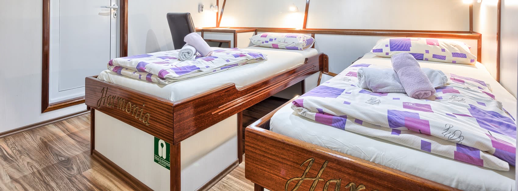 Harmonia (Deluxe) Die Harmonia ist eine elegante, strahlend weiße Motoryacht, die mit ihrer hervorragenden Ausstattung zu den Deluxe-Schiffen unserer Flotte zählt. Die geräumigen Gästekabinen, neun über Deck und sieben unter Deck, verfügen über Bad mit Duschkabine/WC sowie Klimaanlage. Der großzügige und geschmackvoll möblierte Salon wie auch das weite, mit einer Liegewiese ausgestattete Sonnendeck genügen selbst höchsten Ansprüchen. An der Bar erhalten Sie immer eine reichhaltige Auswahl gekühlter Getränke. Über eine Badeplattform am Heck des Schiffes ist der Zugang zum Meer unkompliziert – uneingeschränktes Badevergnügen ist garantiert. Die erfahrene Crew sorgt für einen warmherzigen und ausgesprochen aufmerksamen Service an Bord. Eine Schiffsreise auf der Harmonia bedeutet Genuss, Entspannung und das volle Rundum-Verwöhn-Paket zugleich! Privater Charter Anfragen Besondere Merkmale Baujahr: 2012/13 Kabinengröße: 10 - 15 m² Kabinenausstattung: Klimaanlage, Föhn, gefliestes Bad mit Spiegel, Duschkabine, Waschbecken & WC Betten: Doppelbetten 200 x 140 cm, getrennte Betten: 200 x 90 cm Service: Kabinenservice, Handtuchwechsel in der Mitte der Woche Extras: großzügiger Salon, großes Sonnendeck, Stahlschiff mit edler Holz-Innenausstattung, Badeplattform am Heck, Fahrradgarage, kostenfreies Internet
