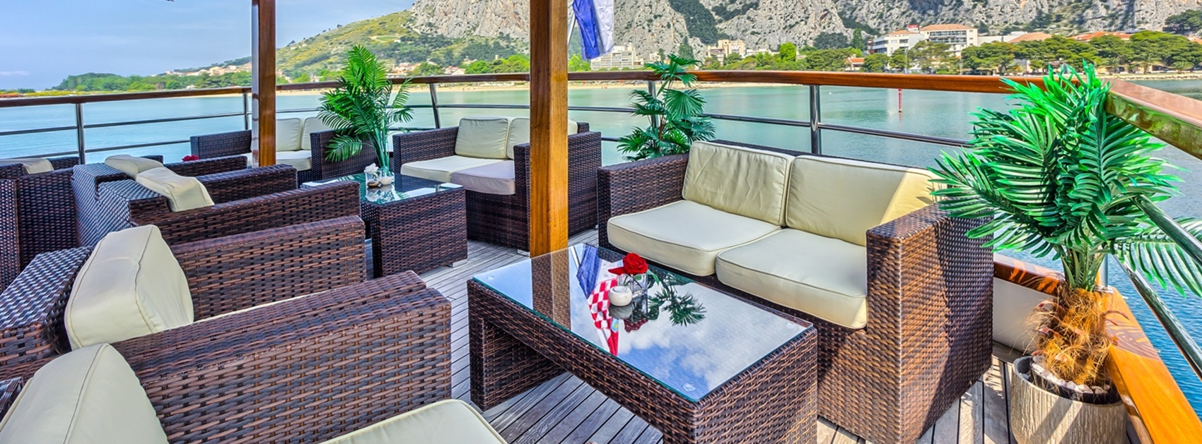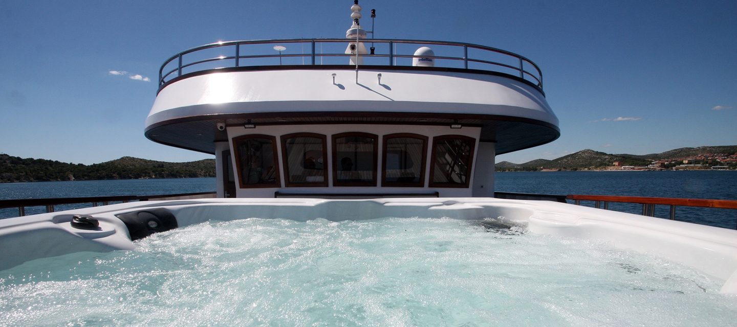 Extras: Badeplattform am Heck, Lounge-Atmosphäre auf dem Oberdeck, gepolsterte Liegen auf dem Topdeck, Piano, Fahrradgarage, kostenfreies Internet