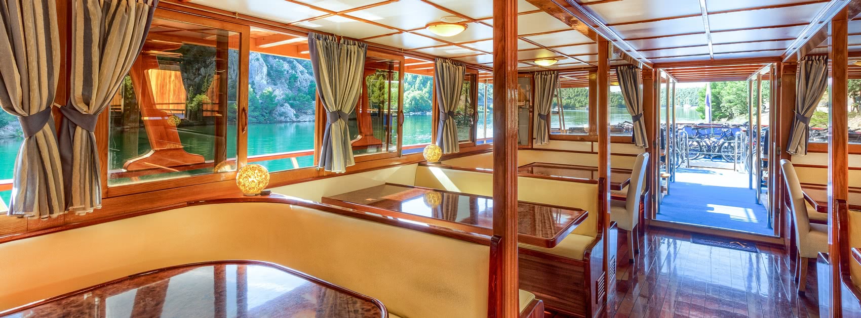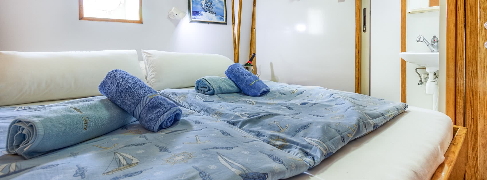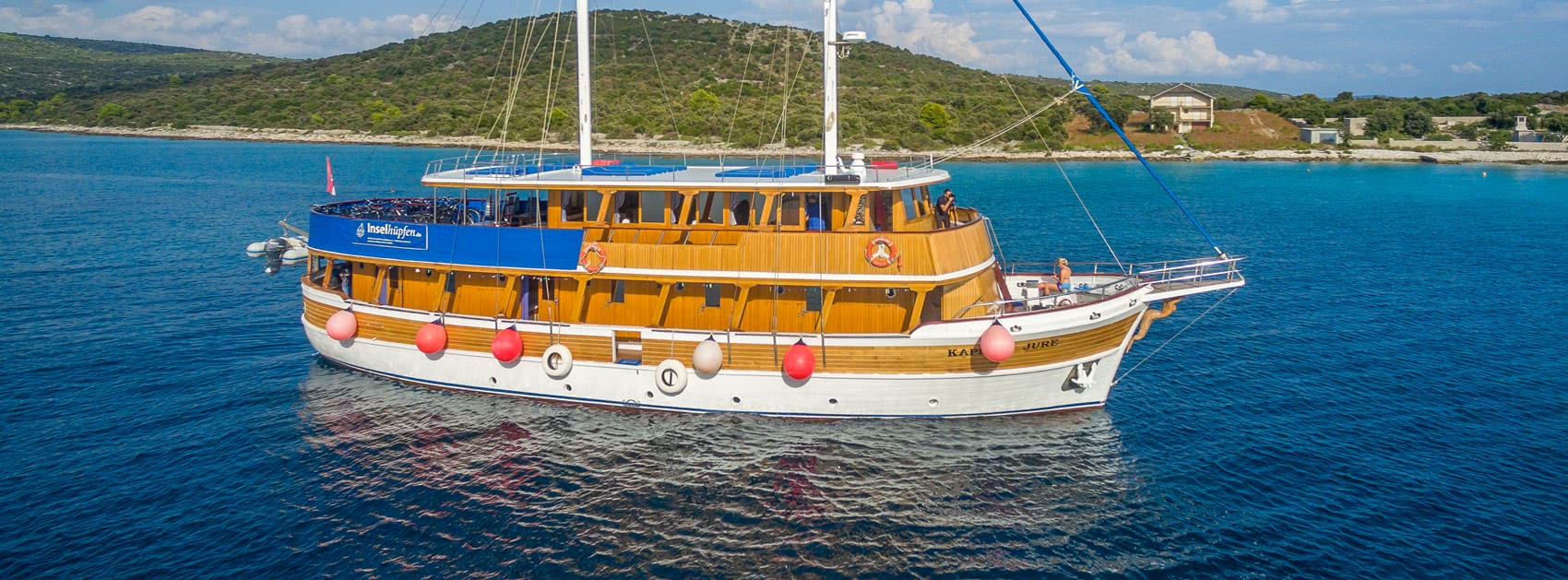 Kapetan Jure (Komfort) Die Kapetan Jure gehört heute zu den kleineren Schiffen unserer kroatischen Flotte. Mit mehreren hundert gefahrenen Touren hat sie jedoch Inselhüpfen-Geschichte geschrieben. Als traditionelles Holzschiff gebaut, spiegelt das Schiff in vielen Details die große Liebe ihres Eigners Anton zur Seefahrt wider: der geräumige Salon ist mit Muscheln, Amphoren und Vitrinen voller Seemannsknoten dekoriert und eine Meerjungfrau wacht am Bug über die sichere Fahrt des Schiffes. Die Kapetan Jure besitzt gemütliche Gästekabinen: vier unter Deck und elf über Deck. Eine geräumige Sitzgruppe auf dem Achterdeck und ein Sonnendeck mit gepolsterten Liegematten tragen zum Wohlfühlen an Bord bei. Genießen Sie ein Sonnenbad oder nehmen Sie sich einfach Zeit für sich selbst, sei es für ein Schläfchen nach der Radtour oder für ein gutes Buch. Auch ein Sprung direkt vom Schiff ins Meer in einer der zahllosen wunderbaren Buchten ist immer ein großartiges Erlebnis. Privater Charter Anfragen Besondere Merkmale Baujahr: 2000 Kabinengröße: 7 - 8 m² Kabinenausstattung: Klimaanlage, Safe, Föhn auf Anfrage (vor Ort), gefliestes Bad mit Spiegel, All in one-Dusche, Waschbecken & WC Betten: Doppelbetten: 200 x 140 cm, getrennte & ebenerdige Betten: 200 x 80 cm Service: Kabinenservice, Handtuchwechsel in der Mitte der Woche Extras: Liegestühle &- matratzen auf dem Sonnendeck, 2 große Tische und Bänke an Deck im Schatten, kostenfreies Internet