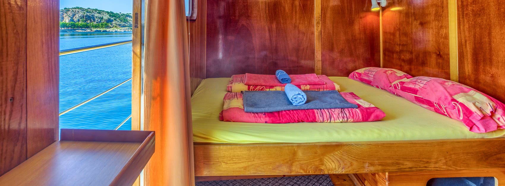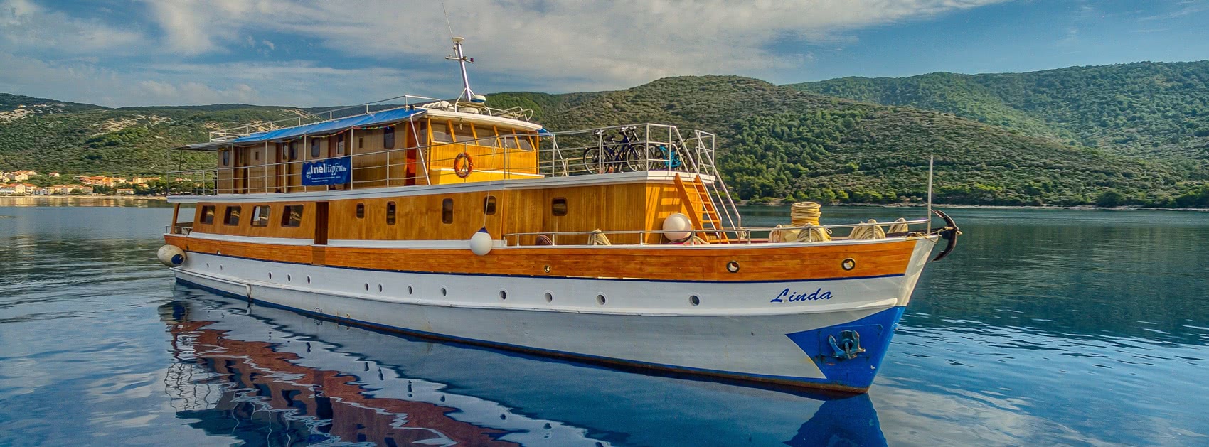 Linda (Komfort) Die hölzerne Motoryacht Linda wurde 2006 speziell für die Bedürfnisse der Inselhüpfer umgebaut, unser ganzes Inselhüpfen-Know-How floss dabei ein. Mit Holz getäfelte Gästekabinen, von denen sich drei unter Deck und elf über Deck befinden, sowie ein großzügiger, geschmackvoll eingerichteter Salon mit Holztischen und -bänken verbreiten Wohlfühlatmosphäre. Ausreichend Platz zur Erholung bietet auch der schöne Außenbereich der Linda. So lädt das große Sonnendeck mit gemütlichen gepolsterten Liegematten, auf denen das entspannte Sonnenbaden noch mehr Freude macht, zum Relaxen ein. Bei gutem Wetter kann man an den Außentischen essen oder abends in gemütlicher Runde einen erlebnisreichen Urlaubstag Revue passieren lassen. Die seit vielen Jahren zusammenarbeitende Crew kümmert sich rührend um ihre Gäste und freut sich darauf, Ihnen einen unvergesslichen Urlaub zu bereiten. Privater Charter Anfragen Besondere Merkmale Baujahr: 1955 - komplett umgebaut 2006 Kabinengröße: 7 - 8 m² Kabinenausstattung: Klimaanlage, Föhn, gefliestes Bad mit Spiegel, All in one-Dusche, Waschbecken & WC Betten: Doppelbetten: 200 x 140 cm, getrennte & ebenerdige Betten: 200 x 80 cm Service: Kabinenservice, Handtuchwechsel in der Mitte der Woche Extras: Liegematratzen auf dem Sonnendeck, großer Tisch und Stühle an Deck im Schatten, kostenfreies Internet